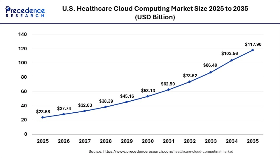 The U.S. healthcare cloud computing market size accounted for USD 23.58 billion in 2025 and is estimated to reach around USD 117.9billion by 2035, growing at a CAGR of 17.46% from 2026 to 2035.